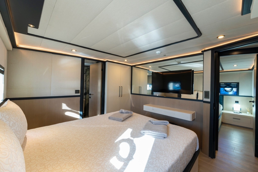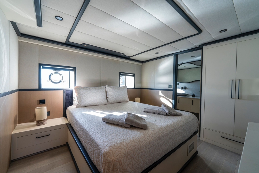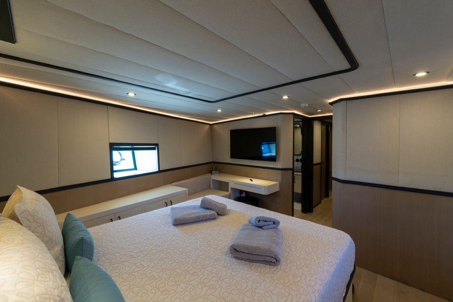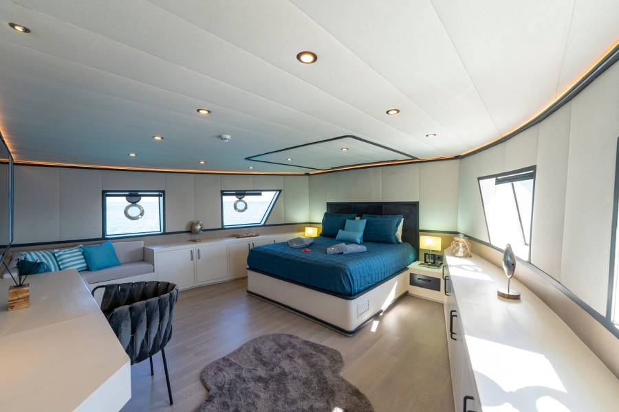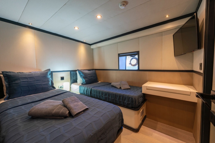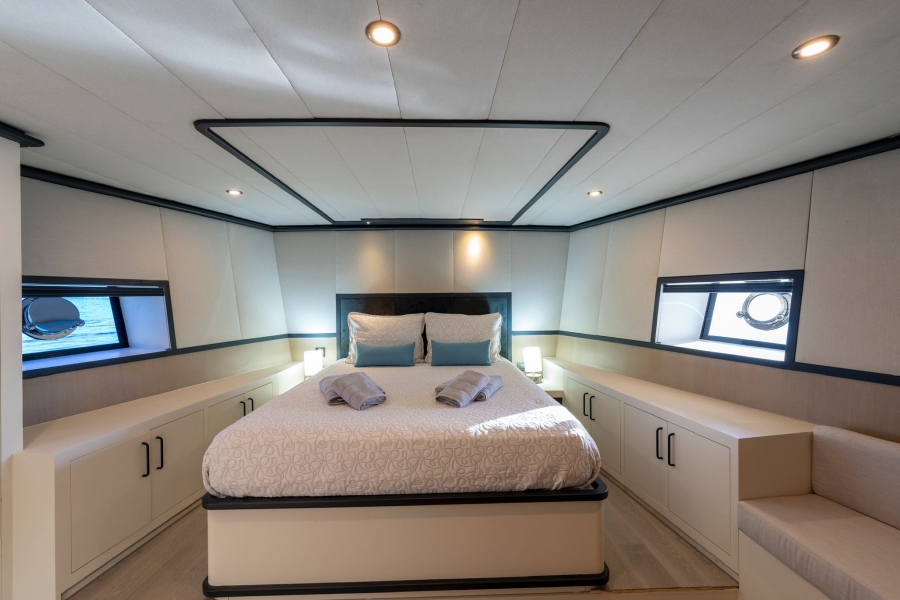 The yacht offers 2 Master Suites, 2 VIP Double Cabins, 1 Double Cabin, and 1 Twin Cabin — all with en-suite bathrooms and air conditioning.