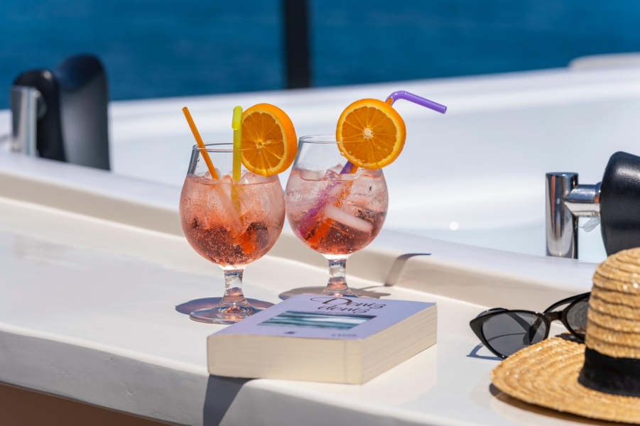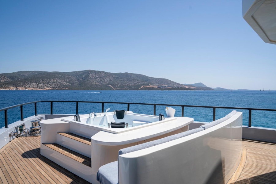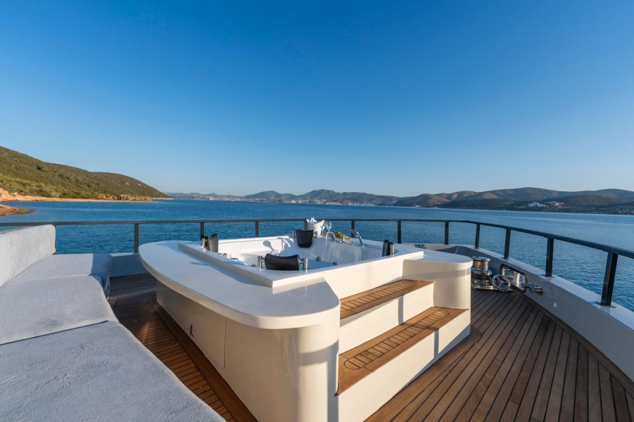 Flybridge: Jacuzzi, sunbeds, and 360° sea views