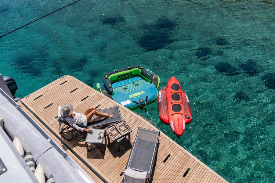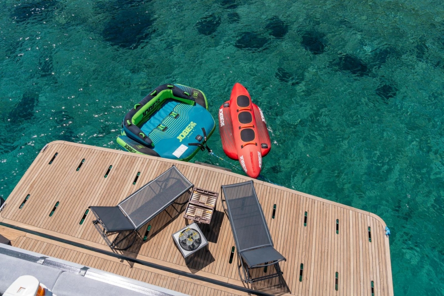 The yacht is equipped with a jet ski, paddleboard, wakeboard, water ski, ringo, banana, snorkeling gear, fishing equipment, and a 110 HP Joker boat. SeaBob is available for rent.