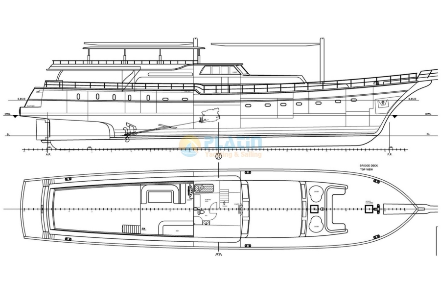 The yacht cruises comfortably at around 12 knots with efficient fuel consumption for extended blue cruises.