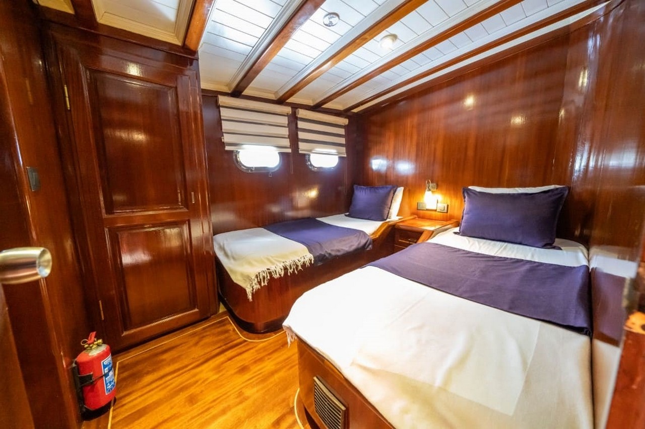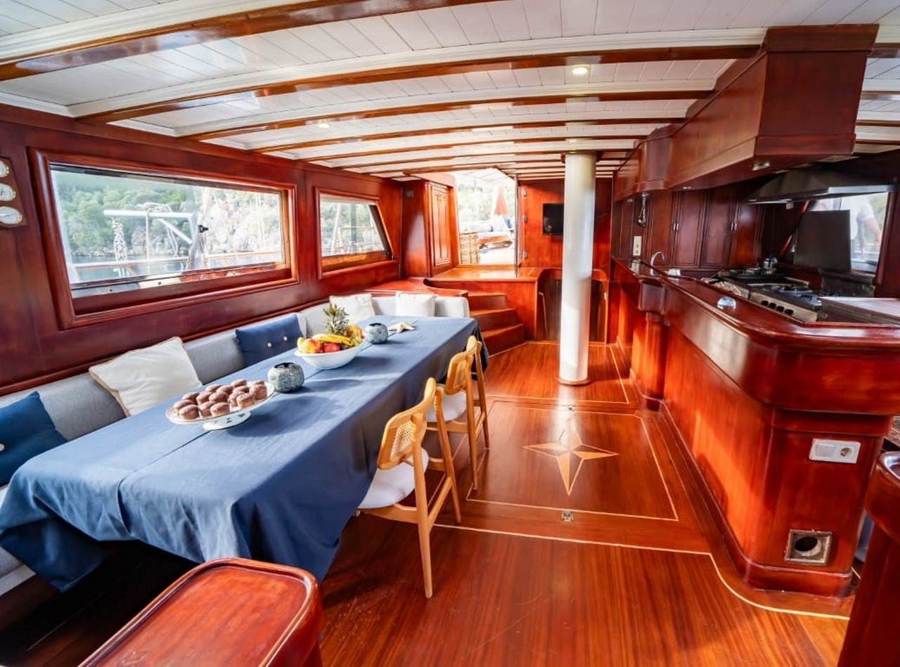 Yücebey Gulet features 5 elegantly designed cabins that provide maximum comfort and privacy for all guests. Each cabin is equipped with modern amenities, en-suite bathrooms with shower, climate control, ample storage, and large windows allowing natural light and sea views. The interior layout ensures a spacious and welcoming atmosphere for relaxation.