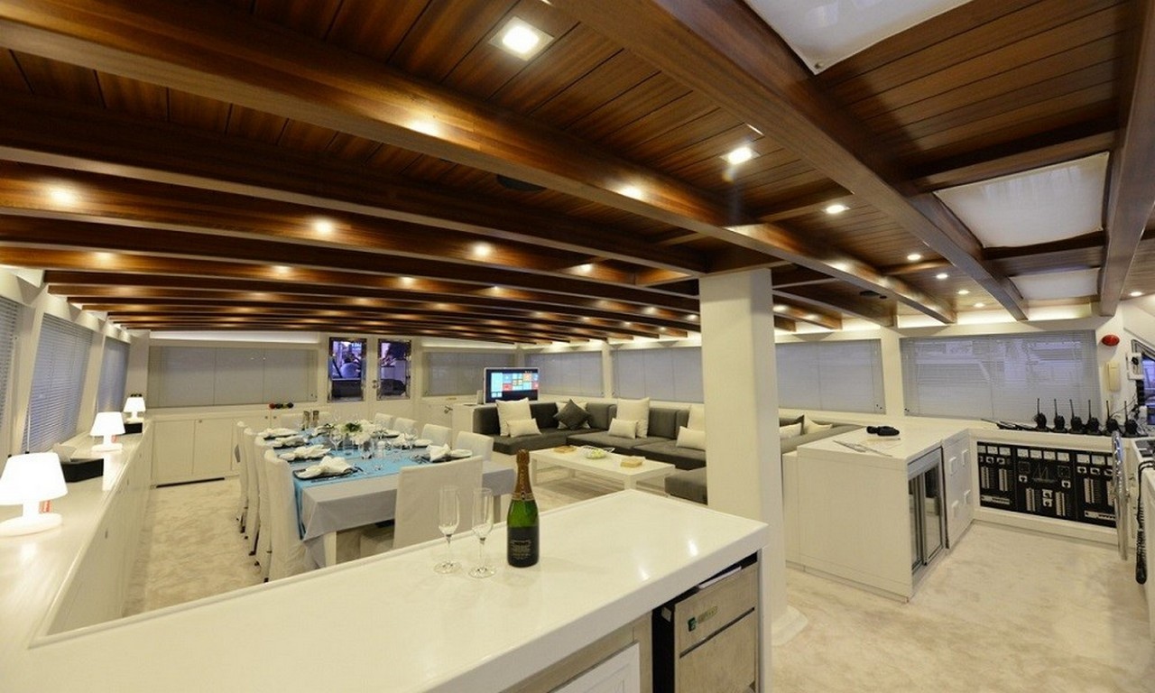 The salon serves as the heart of the yacht, with a large seating area, dining table, and bar. It’s perfect for daytime relaxation or evening conversations. The open design and stunning sea views ensure that your time inside is as much a part of the blue cruise experience as life on deck.